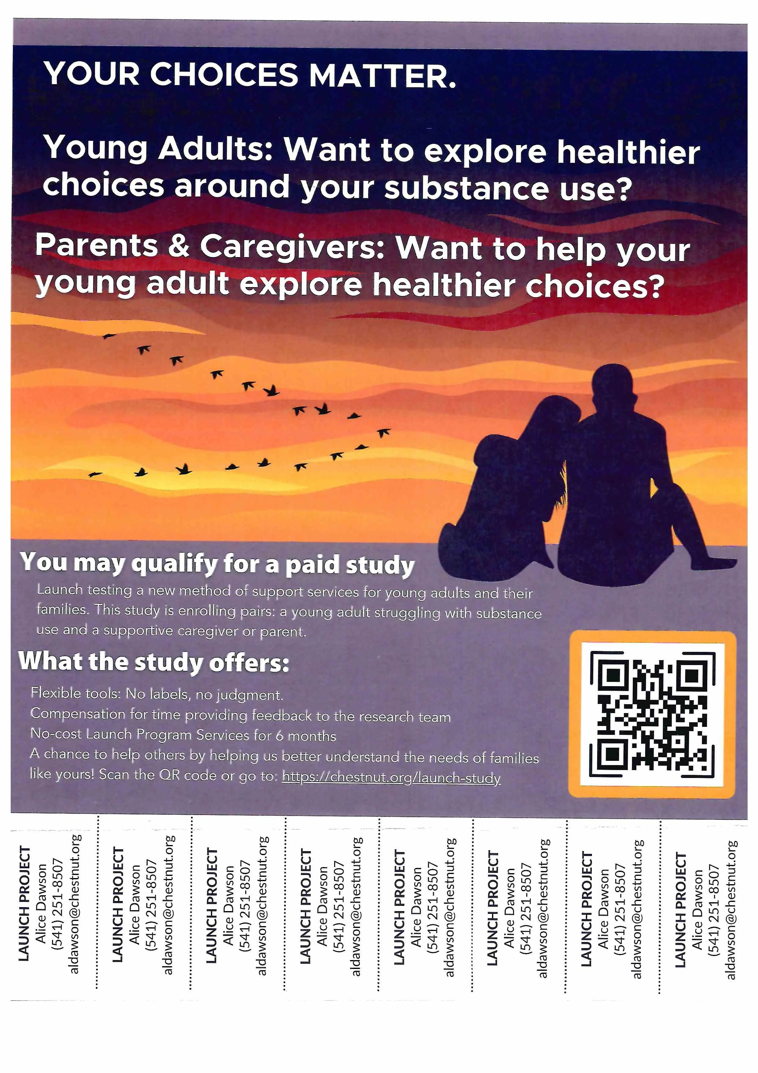 Chestnut Health Systems’ Lighthouse Institute is recruiting Emerging Adults (18-26 years old) who are facing challenges related to substance use, along with their parents, for a paid research study seeking feedback for a new recovery program called Launch. Participating families will receive Launch services at no-cost, be compensated for virtual research visits, and there is no waitlist! Call or Text Alice today (541-251-8507) or fill out the form on the Launch Website for more information: https://www.chestnut.org/launch-study